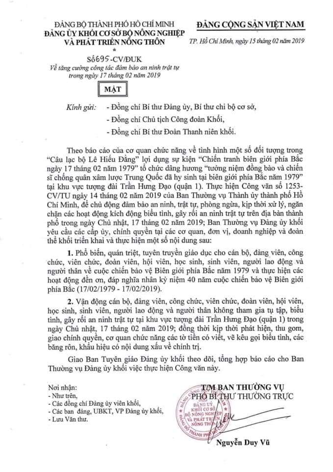 Đạo diễn của màn kịch kỷ niệm giả, đàn áp thật này đã huy động sức mạnh toàn đảng, cả hệ thống chính tri để thi hành. Mạng xã hội đã loan truyền văn bản của mật Đảng ủy khối cơ sở Bộ Nông nghiệp và Phát triển Nông thôn chỉ đạo về việc tăng cường đảm bảo an ninh trật tự trong ngày 17/2/2019 {hình 1}. Một đảng bộ chuyên ngành nông nghiệp lại tham gia vào hoạt động này đương nhiên là các đảng bộ khác không thể đứng ngoài. Tội nghiệp cho người dân Việt phải còng lưng đóng thuế nuôi bộ máy cầm quyền để họ có đủ thế lực phương tiện điều kiện đàn áp, bóp ngẹt quyền yêu nước của người dân để giới lãnh đạo chóp bu hể hả báo công cho ngoại bang.