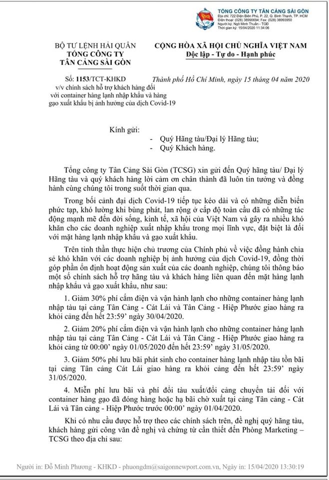 Thực trạng này nghiêm trọng đến mức Tổng Công Ty Tân Cảng, thuộc Bộ Tư lệnh Hải Quân đã ra công văn thông báo hổ trợ cho các đối tác gặp khó khăn vì đại dịch. Trong đó miễn phí lưu bải và phí đồi tàu chuyển cảng đối với mặt hàng gạo đã đóng cont nhập bải từ trước ngày 1-4