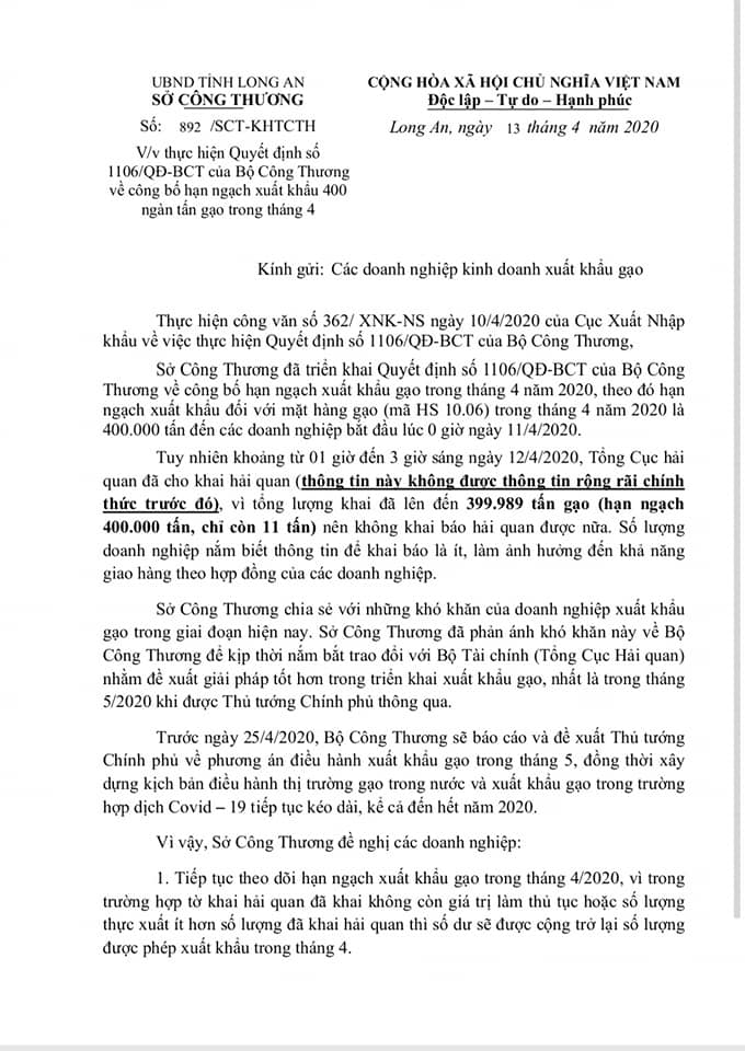 Ngày 15-4, ông Nguyễn Minh Toại - giám đốc Sở Công thương Cần Thơ, báo cáo gửi Bộ Công thương và Bộ Tài chính đề xuất một số giải pháp về lượng gạo của các doanh nghiệp trên địa bàn đang nằm chờ xuất khẩu tại các cảng.