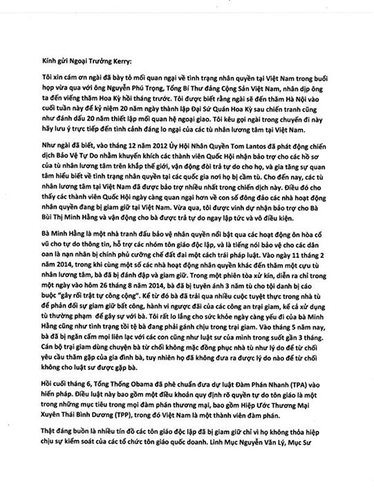 ..."Trong lúc chính phủ Việt Nam đang chuẩn bị chào mừng ngày Quốc Khánh 2 tháng 9, tôi kêu gọi ngài hãy lên tiếng đòi trả tự do ngay lập tức và vô điều kiện cho bà Bùi Thị Minh Hằng cũng như các tù nhân lương tâm khác, mặc dù không được biết nhiều tới nhưng không kém phần quan trọng. Họ đang phải chịu khổ nạn sau chấn song nhà tù chỉ vì dám bảo vệ những quyền cơ bản cho họ cũng như cho đồng bào của mình."