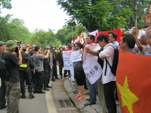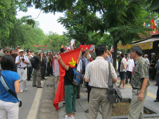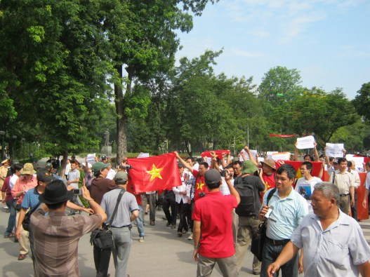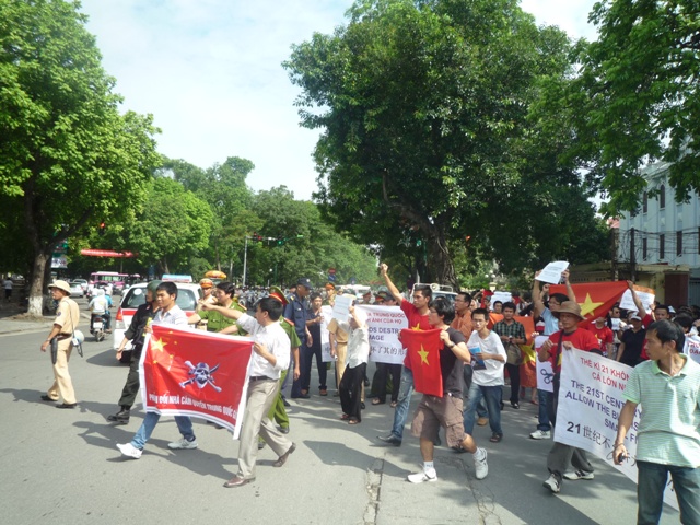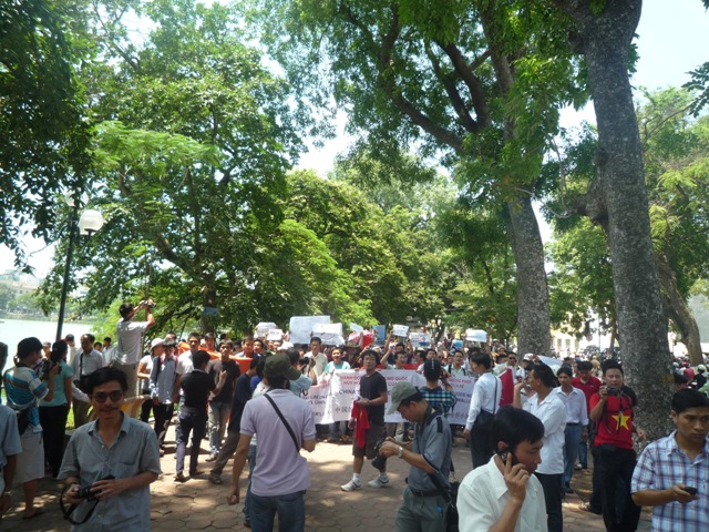Tin cho hay, tại Hà Nội hiện tại đoàn biểu tình vẫn tiếp tục tuần hành quanh Bờ Hờ, lúc này đã đi đến Nhà hàg Thủy Tạ. Ước tính, số lượng người biểu tình đã lên đến khoảng hơn 200 người. Tin cho biết, cách đây 15 phút, một lực lượng rất đông cảnh sát cơ động đã kéo đến nhằm chia cắt đoàn biểu tình, nhưng kế hoạch đó đã bất thành.