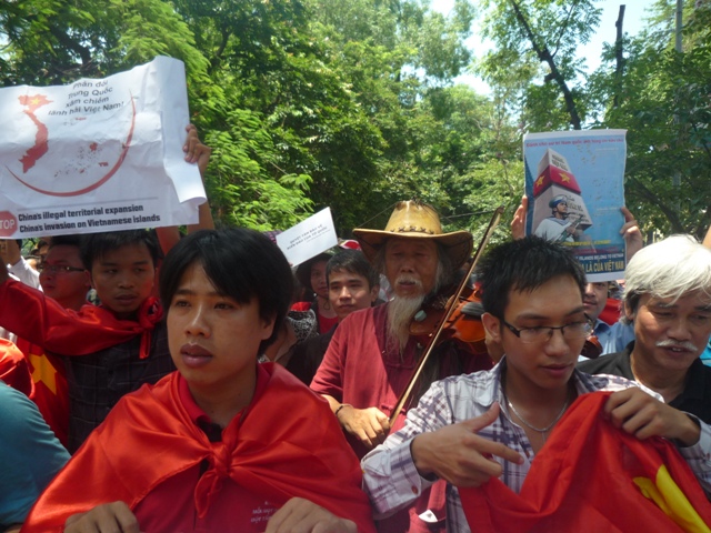 Lúc 10:35 tại Hà Nội, tin cho biết số lượng người tham gia mỗi lúc một đông thêm, không khí rất hào hùng, đoàn kết. Trong đoàn biểu tình lúc này, có sự góp mặt của hai nghệ sỹ mang theo Violon và kèn Saxophone, đoàn người vừa tuần hành vừa hát những bài ca yêu nước.