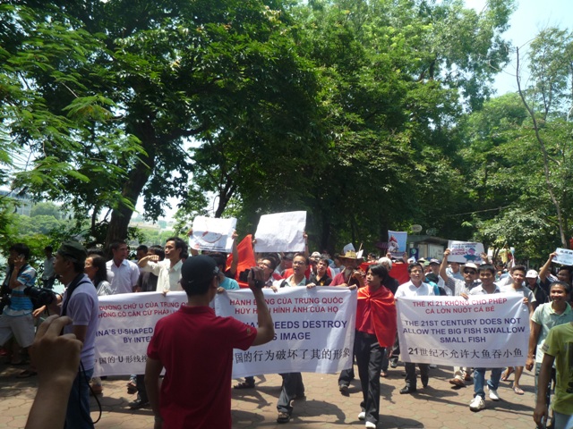 Lúc 8H30' tại Hà nội đã bắt đầu biểu tình, đám đông hô vang các khẩu hiệu đả đảo Trung Quốc, khẳng định chủ quyền của Việt Nam đối với Hoàng Sa - Trường Sa, tẩy chay hàng hóa TQ ...hát quốc ca trước Viện Bảo tàng Quân đội. Trong khi đó, tiếng loa của CA yêu cầu đoàn biểu tình giải tán nhắc đi nhắc lại liên tuc. Đám đông biểu tình bị ngăn cản, không cho sang đường vào Vườn hoa Lê-nin.