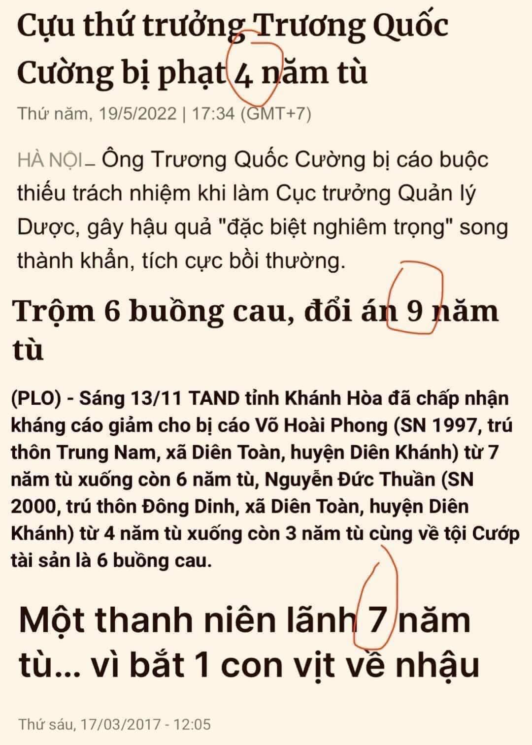 Một bức ảnh ghép tít của ba bài báo về ba vụ án được lưu truyền rộng rãi trên mạng kèm theo những lời bình phẩm đau đáu về sự bất công của luật pháp hay nói khác hơn là về sự chập chờn của cái lò trị tham nhũng mà cụ Tổng vẫn luôn tự hào